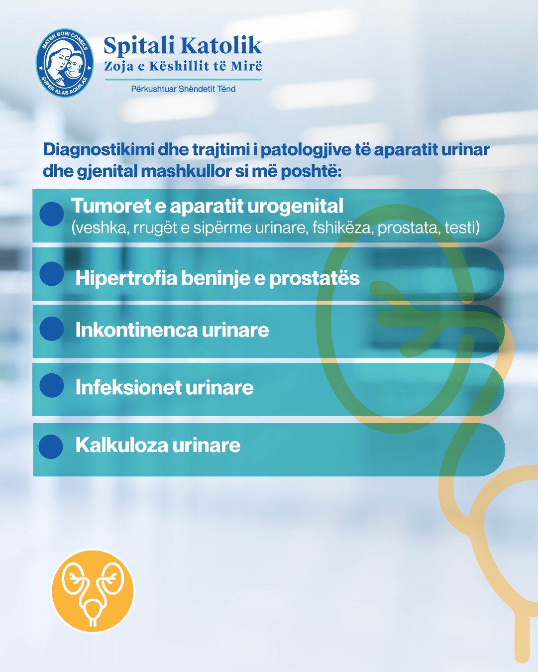Në Spitalin Katolik Zoja e Këshillit të Mirë ofrohet diagnostikim dhe trajtim i plotë i patologjive urologjike, duke përfshirë sëmundjet e prostatës (kanceri i prostatës, hiperplazia beninje e prostatës, prostatiti) si dhe patologjitë e fshikëzës urinare (cistitet, tumoret e fshikëzës, etj.)