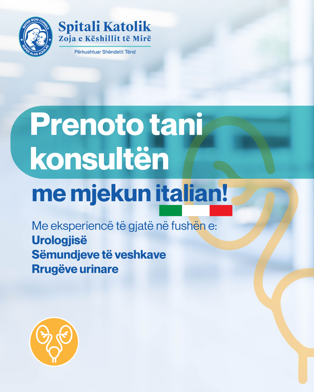 Mjeku italian Prof. Savino Di Stasi do të jetë i pranishëm për konsulta urologjike pranë Spitalit Katolik Zoja e Këshiillit të Mirë në datat 30 Mars -3 Prill 2026.